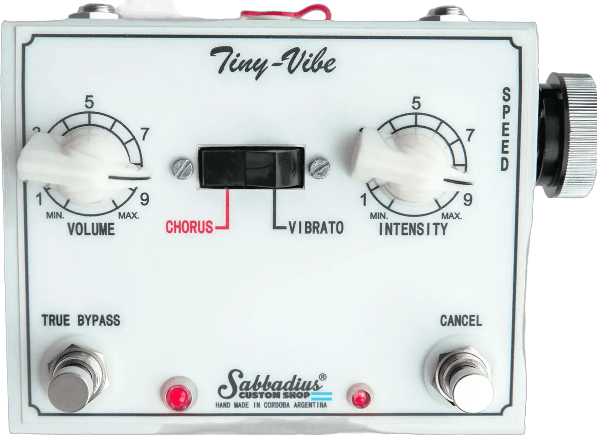 The Sabbadius Tiny-Vibe is an analog uni-vibe style modulation pedal designed to deliver vintage-style chorus and vibrato, utilizing the same PCB and components as the larger Funky-Vibe model, but housed in a more compact enclosure. This modulation pedal retains all core circuit elements except for the foot control jack, which has been replaced by a SPEED knob positioned for foot adjustment. The pedal does not include a fuse socket or internal transformer.