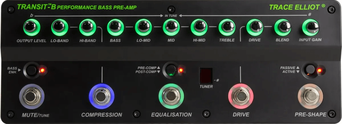 The Trace Elliot Transit B is a bass preamp effects pedal featuring tone shaping, dynamic control, and versatile connectivity. It includes a Pre-shape function, 5-band EQ, and a dual-band compressor for detailed sound adjustment. Drive with blend control and bass enhancement offer additional tonal flexibility. The backlit panel doubles as a chromatic tuner for precise tuning visibility. Connectivity options include pre and post XLR balanced outputs, dry output, and headphone output for adaptable signal routing.