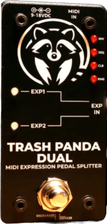 The Trash Panda Dual is a MIDI-controllable expression pedal splitter, designed to route a single expression pedal input (EXP IN) to two separate outputs (EXP1 and EXP2). This utility pedal provides toggle control via footswitch, allowing musicians to activate EXP1, EXP2, both outputs, or disable them, with the inactive output maintaining its most recent value. Output polarity inversion and custom heel-to-toe range adjustment are available per output, offering flexible control configurations. The Trash Panda Dual also features internal LFO modulation, which can be synchronized to MIDI clock, supporting advanced control voltage (CV) and LFO applications in pedalboards or modular setups.