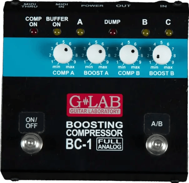 The G-LAB BC-1 Boosting Compressor is an analog compressor effects pedal featuring an opto component for dynamic signal control. This stompbox offers compression and volume (boost) adjustment across two independent channels, with a footswitch enabling quick transitions between subtle and strong compression settings. The BC-1 operates with ultra-low noise, minimizing unwanted pumping or breathing artifacts.
