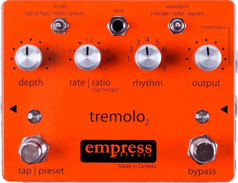 The Empress Tremolo2 is an analog tremolo effects pedal featuring digital control via optical technology. Designed to provide multiple modulation waveforms and rhythmic options, this stereo tremolo pedal offers tap tempo, eight selectable waveforms, and eight preset locations for storing custom settings. Connectivity includes a control port supporting external tap tempo, expression pedal input, CV input, and MIDI control. The Tremolo2 maintains an all-analog audio path for signal integrity, with modern control flexibility for a wide range of tremolo effects.