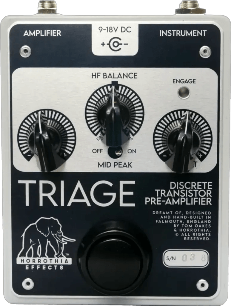 The Horrothia Triage is an all-transistor boost and overdrive effects pedal designed to provide adjustable grit, clean boost, and level control. The pedal features a JFET preamp section followed by an internal clean-level trimmer, feeding into a discrete transistor-based overdrive stage. The MID PEAK switch engages a focused midrange boost, while the HF balance control adjusts the high-frequency response for either cutting or boosting treble content. With the MID PEAK switch off, the pedal functions as a full-range boost; with the switch on, a pronounced mid-bump is added to the signal. The Triage is compatible with bass instruments.