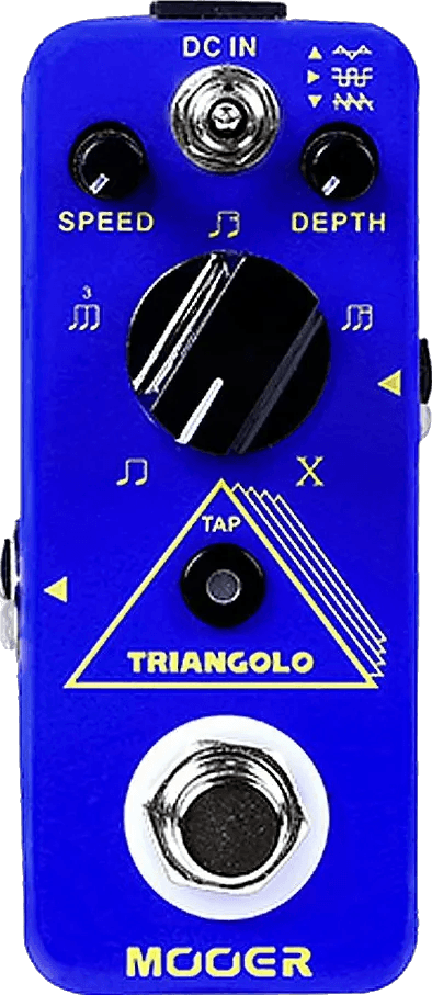 The Mooer Triangolo is a digital tremolo effects pedal offering selectable LFO wave shapes and advanced rhythmic options. This tremolo stompbox features a 3-way switch to choose between triangle, square, and sawtooth waveforms, allowing users to shape the character of the modulation. Onboard controls include Speed, Depth, and a five-position Sub-Division selector for multiple rhythmic patterns. The pedal features a tap tempo function for real-time speed adjustment, supporting flexible tempo synchronization.