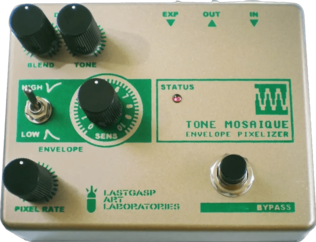 The TONE MOSAIQUE - Envelope Pixelizer is a wave shaper effects pedal designed to sample the input signal using analog methods and alter its resolution for diverse tonal results. This pedal is capable of producing effects similar to a bitcrusher, ring modulator, tremolo, and envelope filter. The pixel rate can dynamically track the input’s envelope, allowing for interactive sound manipulation. An expression pedal input is provided via the EXP jack, allowing for real-time control of the pixel rate.