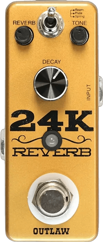 The Outlaw Effects 24k Gold Reverb is a digital reverb pedal designed to provide a range of ambient effects. This Outlaw Effects pedal offers three selectable reverb modes: ROOM for natural small-room ambience, PLATE for vintage-inspired plate reverb tones, and SPRING for classic spring reverb sounds. Core controls allow adjustment of reverb level, tone, and decay to shape the effect to your preference. The pedal features true bypass switching to maintain your instrument’s signal when disengaged.