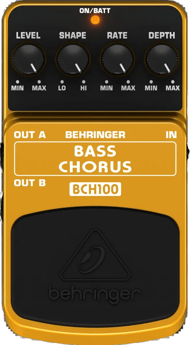The Behringer BCH100 Ultra Bass Chorus is a stereo chorus effects pedal designed specifically for bass instruments. It delivers chorus processing to the upper frequencies of your signal while preserving clarity and punch in the low end. The Shape control adjusts the amount of low-frequency content affected by the chorus, functioning similarly to a crossover circuit. Additional controls include Level for output adjustment, Rate for modulation speed, and Depth for chorus intensity. Connectivity features include stereo output and electronic noiseless switching. Power is supplied via 9V battery or a DC power adapter (not included).