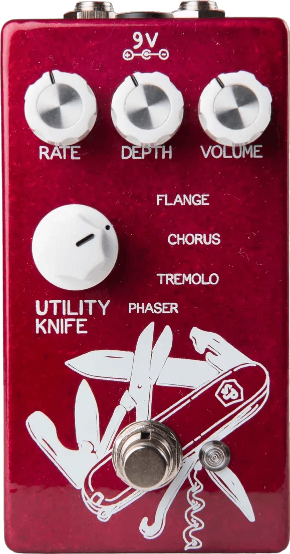 The Utility Knife from [Brand] is a multi-effect modulation pedal that offers four modulation types: flange, chorus, tremolo, and 6-stage phaser. Designed with a streamlined interface, it features dedicated controls for each effect, allowing quick adjustments without complexity. This true bypass modulation pedal uses top-mounted jacks for efficient pedalboard integration and preserves signal integrity. The Utility Knife modulation pedal is engineered for reliable, high-quality performance across all effect choices.