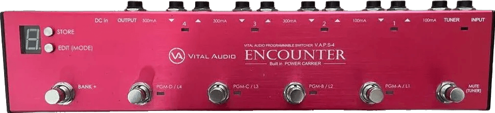 The ENCOUNTER VAPS-4 is a programmable effects loop switcher designed for managing up to four individual effect loops in a pedalboard setup. This loop switcher features 4 independent loops, an isolated tuner out, and supports storage of up to 20 custom presets, organized into 5 banks with 4 preset slots each.