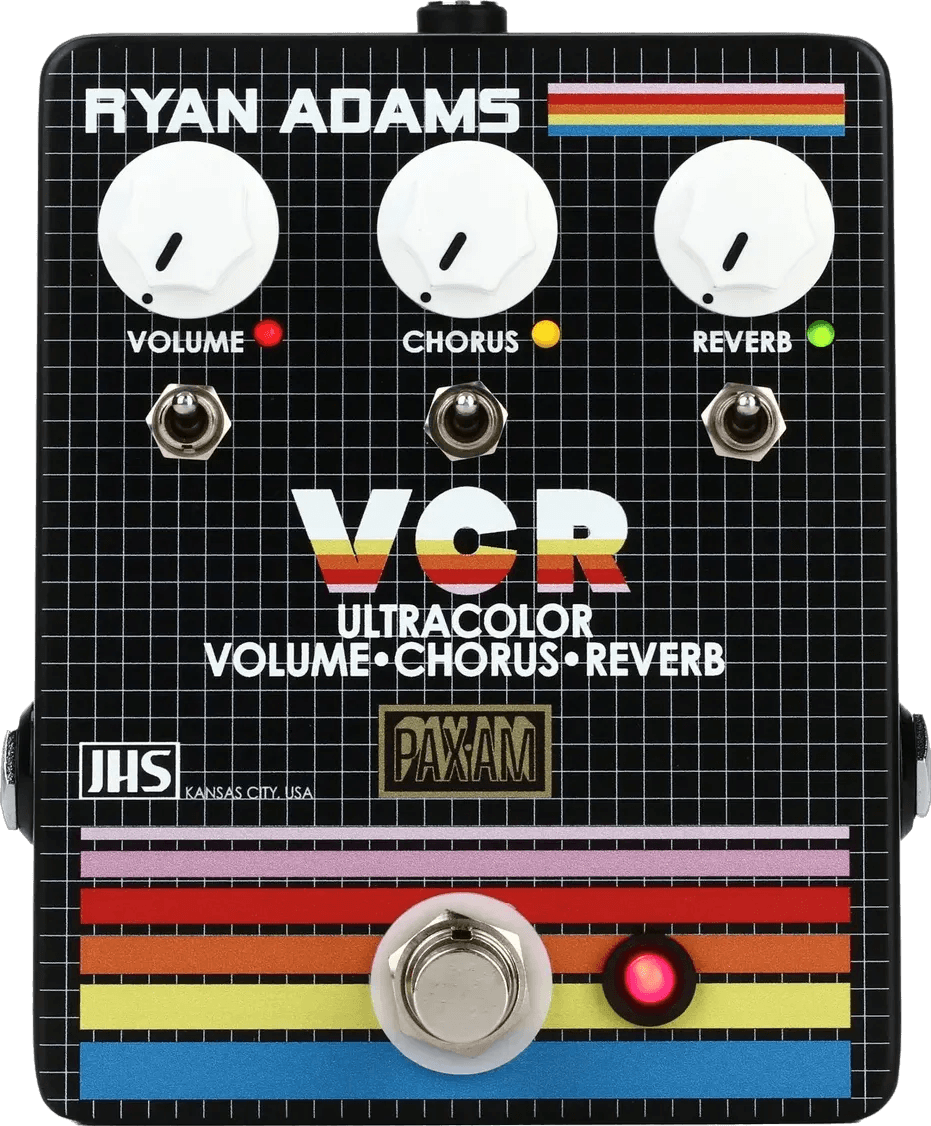 The JHS VCR is a multi-effect guitar pedal that combines analog volume boost, chorus modulation, and reverb in a single unit. Designed in collaboration with Ryan Adams and PaxAM, the VCR pedal provides independent controls for each effect, allowing users to layer or engage volume boost, analog chorus, and ambient reverb together or separately. This effects pedal offers straightforward switching to combine or isolate its three sections, making it suitable for building complex sound textures with a simple interface.