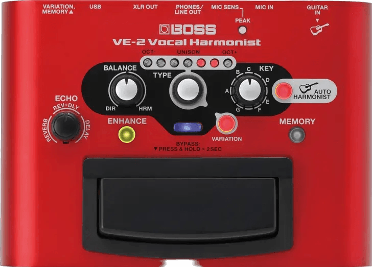 The BOSS VE-2 Vocal Harmonist is a compact vocal effects pedal designed to create real-time harmonized vocals and enhance vocal performances. This battery-powered stompbox generates harmonies that track your singing, using input from a connected guitar, a set key, or a blend of both, with three distinct operation modes for flexible vocal arrangements. The unit provides vocal effects, including reverb, delay, and an enhancer with real-time pitch correction. It also features a USB audio interface for direct recording of processed vocals to a computer. Compatible with portable setups, the VE-2 Vocal Harmonist is intended for singers seeking studio-quality effects in a pedal format.