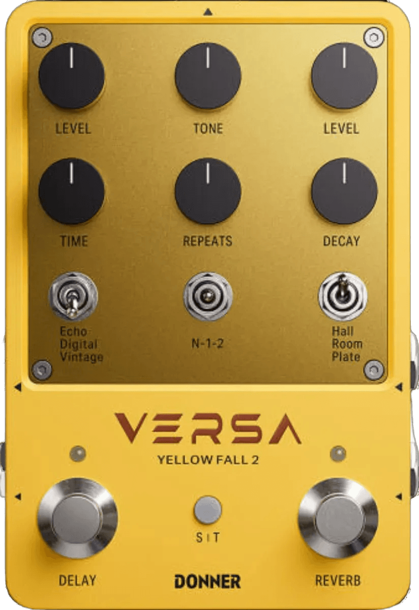 The Donner Versa Yellow Fall 2 is a stereo delay and reverb effects pedal designed for flexible sound shaping. This pedal offers 3 delay models and 3 reverb models, each with adjustable controls such as delay time, reverb depth, reverb size, and pre-delay. The double tap layout allows independent on/off switching for delay and reverb functions. With 2x2 stereo input and output, the Yellow Fall 2 enables a wide range of stereo mixing options while maintaining signal clarity. The user interface includes parameter controls for detailed effect customization.