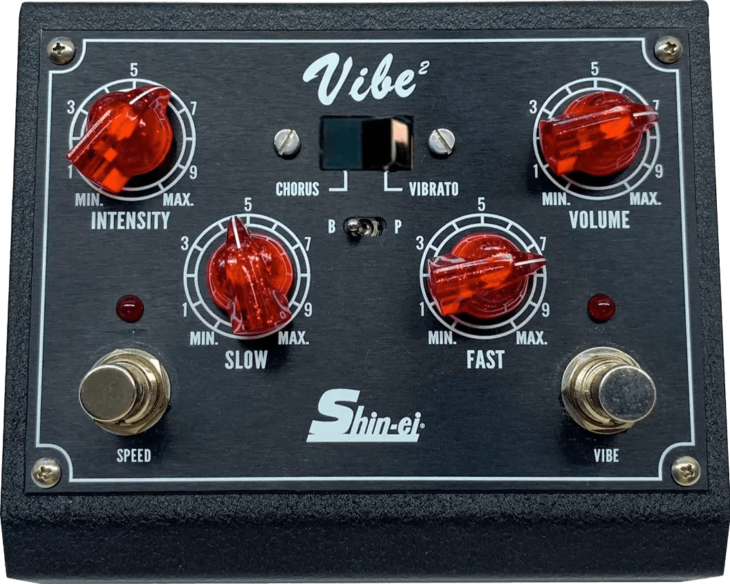 The Shin-Ei Vibe-2 is a modulation effects pedal designed to produce classic Uni-Vibe-style sounds, offering users selectable speed controls via dedicated foot switch. This analog vibrato/chorus pedal provides the option to toggle between true bypass switching and the traditional Uni-Vibe preamp mode for flexible signal routing. Powered by a 24V DC supply, the Vibe-2 is constructed with a compact enclosure for streamlined integration on crowded pedalboards. The pedal’s design emphasizes sturdy build quality, and its controls are tailored for practical use in a range of effects setups.