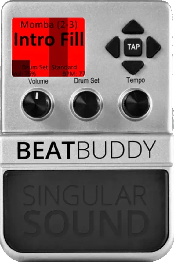 The Singular Sound Beat Buddy is a drum machine pedal designed for live performance and practice, delivering realistic, 24-bit studio-quality drum beats in a stompbox format. This drum machine pedal features over 220 preset styles across 24 musical genres, with intuitive foot-controlled operation for triggering drum fills, transitions, intros, and outros. Extensive onboard memory and SD card support allow for storing up to 3 million user-created or downloaded songs. The pedal includes BeatBuddy Manager software, which enables users to edit drum patterns and manage set lists. Drums are played through dynamic, professional-grade samples processed at 32-bit floating point for enhanced audio quality.