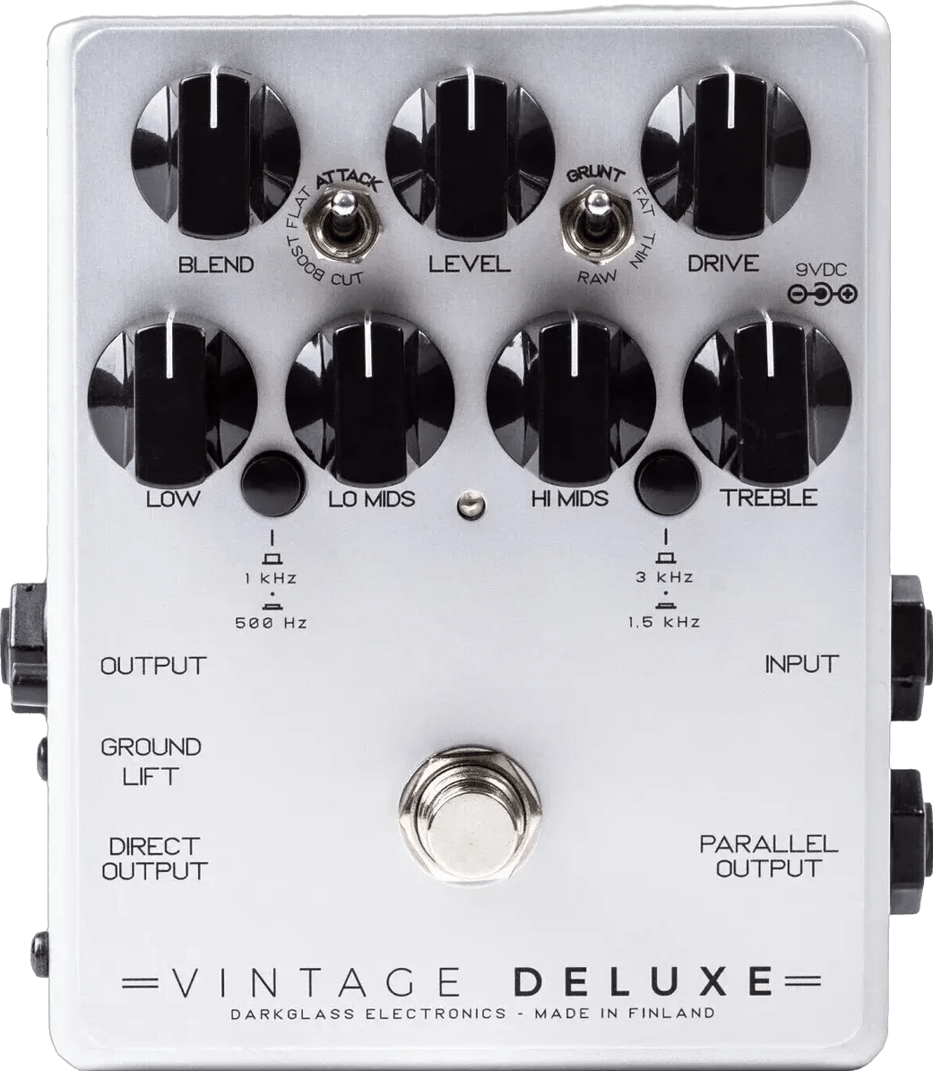 The Darkglass Vintage Deluxe is a bass overdrive effects pedal designed to deliver tube-style warmth, organic compression, and dynamic response. Building on the Microtubes Vintage, this model includes a 4-band active EQ for wider tonal shaping along with dedicated low and high mid frequency switches. Connectivity features include a parallel output for running unaffected signal and a balanced line driver for direct output to mixers or audio interfaces. The pedal is built to cover a range of vintage-inspired tones and is specifically compatible with bass instruments.