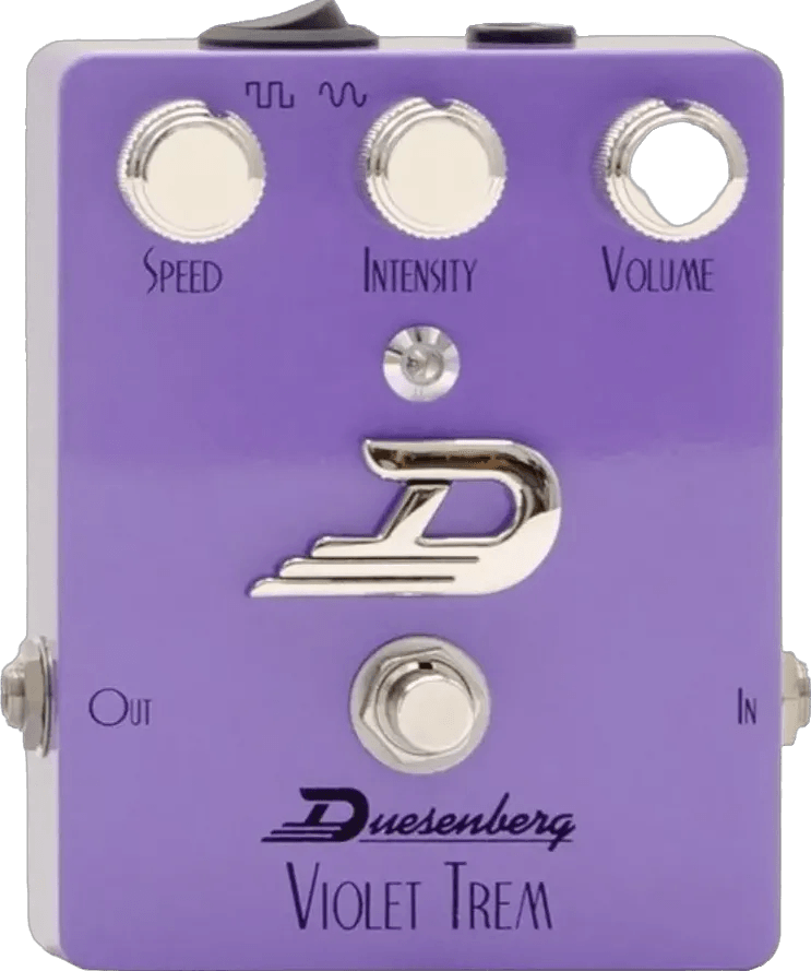 The Violet Trem is an analog tremolo effects pedal designed to deliver classic and modern modulation sounds using a hand-calibrated photocell circuit. The pedal offers two selectable waveforms—hard square and soft sine—via a dedicated switch, providing a range of tremolo styles. The Intensity knob adjusts the depth of the modulation, and setting it to minimum engages a boost/buffer function for added signal flexibility. A Volume control allows compensation for perceived volume drop when the effect is on, as well as adjustment for boosted output. The status LED visually pulses in sync with the selected tremolo rate. The Violet Trem features a true bypass signal path for sound neutrality when bypassed.