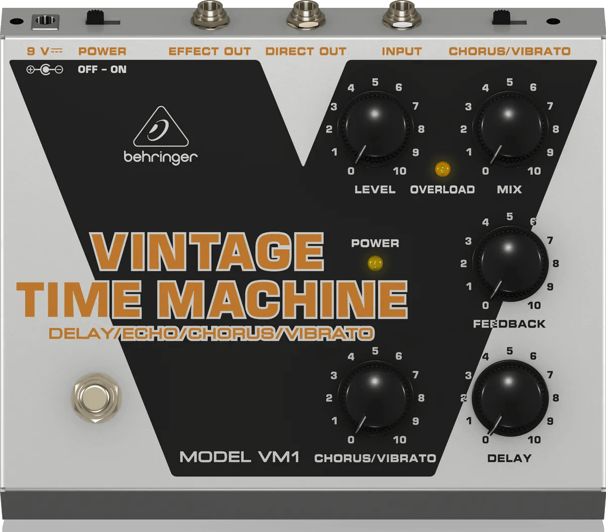 The Behringer Vintage Time Machine VM1 is an analog delay pedal that integrates chorus, vibrato, and delay effects. This multi-effect stompbox provides up to 550 ms of delay time, along with classic analog modulation that includes both chorus and vibrato textures. It features true bypass switching to maintain signal clarity when not active, and an LED indicator to show effect status. The VM1 is designed for musicians seeking vintage-style processing in a single unit.
