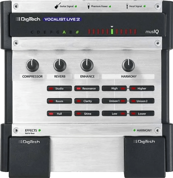 The DigiTech Vocalist Live 2 is a vocal harmony effects pedal that generates two-part vocal harmonies in real time based on the chords detected from your instrument input. Designed for seamless integration into live performance setups, the Vocalist Live 2 analyzes the guitar signal and your voice to produce harmonies that follow your playing and singing.