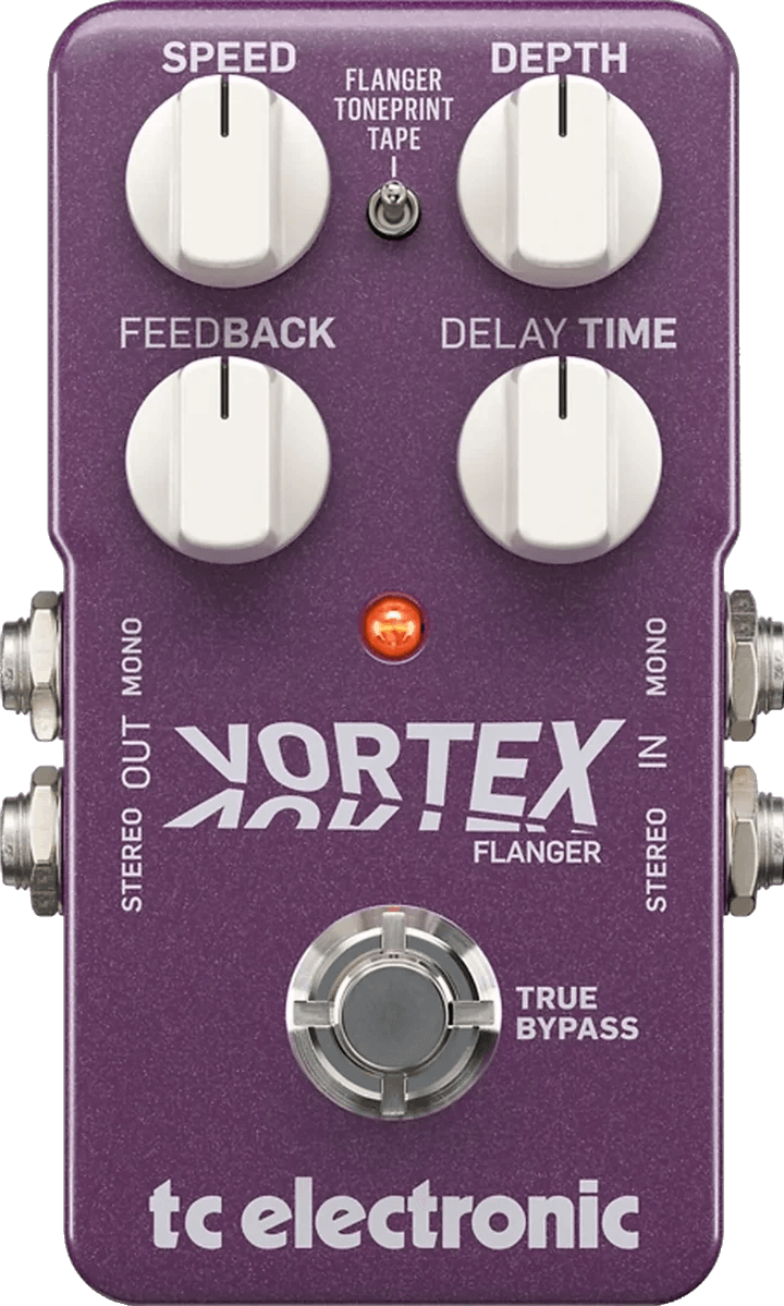 The TC Electronic Vortex Flanger is a flanger effects pedal designed to deliver modulation effects with flexible signal routing options. The pedal utilizes Analog-Dry-Through technology to preserve the dry signal in its pure analog form, without digital conversion. It also includes a Kill-Dry function, which removes the dry signal for use in parallel effects loop setups. Power is supplied by either a standard 9V battery or an external power adapter.