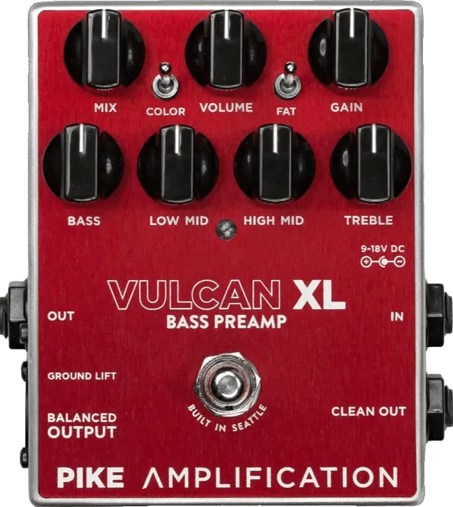 The Vulcan XL is a bass preamp pedal featuring discrete parallel overdrive circuits, a four-band EQ, and a balanced XLR output with ground lift. The signal path splits after the initial gain stage, feeding two independent drive channels, each selectable via a color switch. The drive circuits can be blended with the original input using a dedicated mix control. Tone shaping is managed by a four-band equalizer, while a fat switch enables pre-clipping low-frequency rolloff. For flexible routing, the Vulcan XL provides a clean out jack for parallel signal processing and a balanced XLR output suitable for direct connection to mixing desks. The pedal uses proprietary CMOS true bypass switching for silent, clickless operation. Power is supported at both 9v DC and 18v DC for increased headroom.