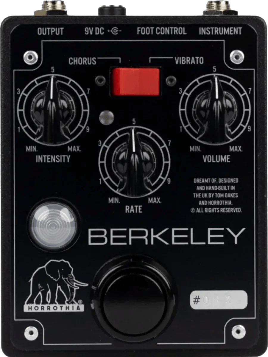 The Horrothia FX Berkeley is a vibe modulation effects pedal designed to closely follow the late 1960s analog signal path. The circuit features carbon film resistors, Mylar capacitors, and carefully selected transistors with characteristics matching vintage units. Slight modifications have been implemented, based on common late-60s adjustments, to increase low-frequency response and fluid modulation texture. Instead of a bulb, the Berkeley uses four hand-matched Vactrol photocells, tested for consistency within a precise operational range. This ensures predictable phase modulation and reliable performance.