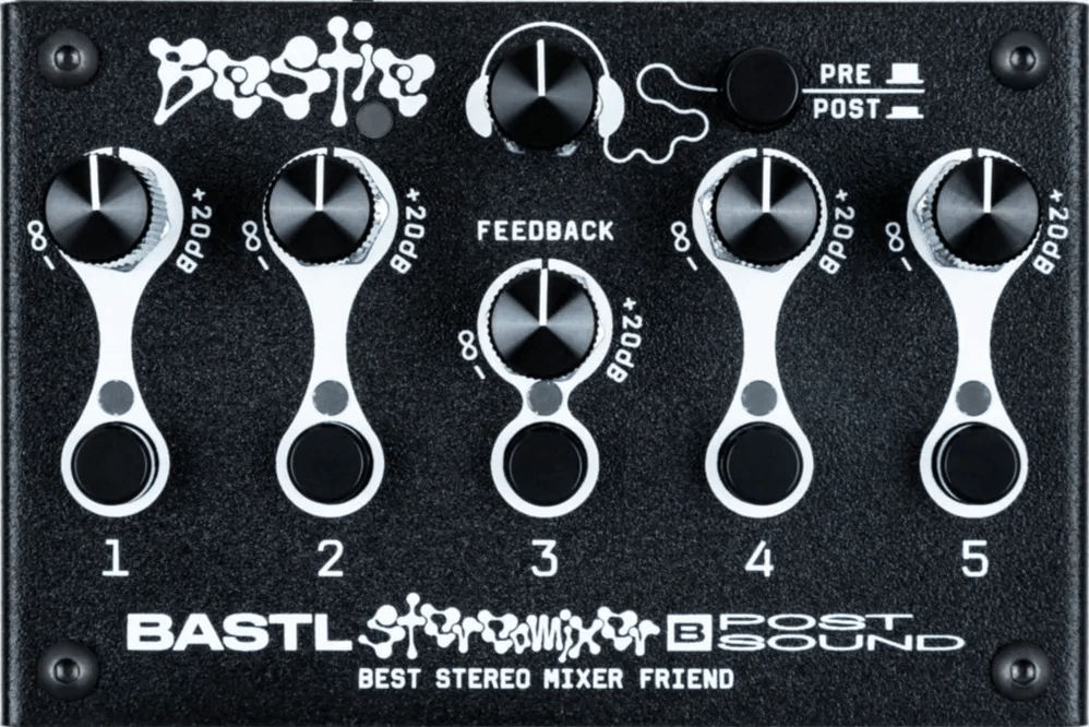 The BASTL Instruments Bestie is a 5-channel stereo mixer and stereo distortion/saturator designed for creative signal processing, mixing, and feedback shaping. Each channel provides up to 20 dB of clean gain, with dedicated mute switches for live muting and switching. A built-in feedback channel offers pre-routed signal routing for generating distortion and saturation effects, depending on channel gain staging. The mixer features a headphone output with independent loudness control, enabling pre/post mute monitoring for cueing channels before they reach the main mix. Channels 1 and 5 support flexible connectivity, accommodating either dual mono cables or stereo jacks for various input configurations.