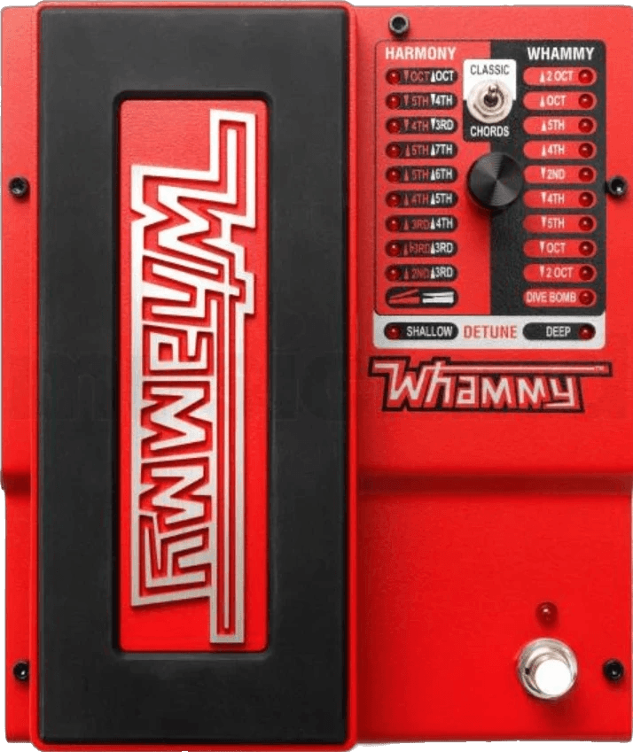 The DigiTech Whammy is a pitch shifter effects pedal designed to create pitch bends, harmony shifts, and dive bomb effects. It features a chordal pitch shifting setting for bending entire chords along with single note pitch shifting capabilities. This DigiTech effects pedal allows for both traditional and modern pitch manipulation on a pedalboard.