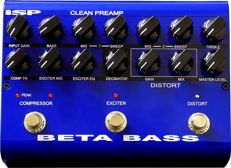 The ISP Technologies Beta Bass Preamp is a bass preamp effects pedal designed to offer a wide range of tone shaping and dynamic control options. The pedal features an ultra-clean preamp section with a multi-band EQ, including bass, treble, and two sweepable mid-frequency controls. Integrated effects include compression for dynamic control, an exciter for harmonic enhancement, the Decimator noise reduction, and variable distortion. Core controls are accessible via dedicated knobs, with footswitch operation for live use. Connectivity options include standard input and output designed for bass instruments.