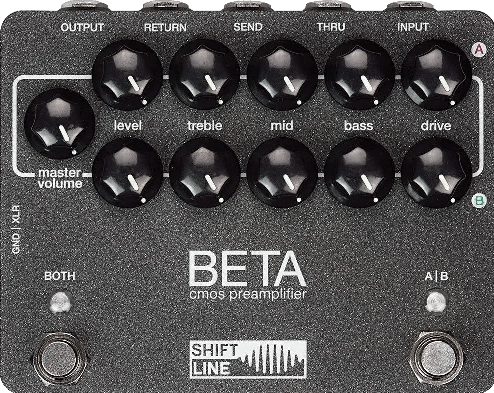 The Shift Line BETA is a CMOS preamplifier effects pedal designed to deliver the tonal characteristics of classic solid state amplifiers from the 1970s. This preamp pedal offers a wide gain range, spanning from clean boost to saturated overdrive, suitable for use in pedalboards, recording setups, or as a direct input to mixers and audio interfaces. The BETA features a three-band EQ for tone shaping alongside controls for Gain, Master Volume, and Level. A true bypass footswitch ensures that signal integrity is maintained when the pedal is not engaged. The device is compatible with bass instruments, making it versatile for various setups.