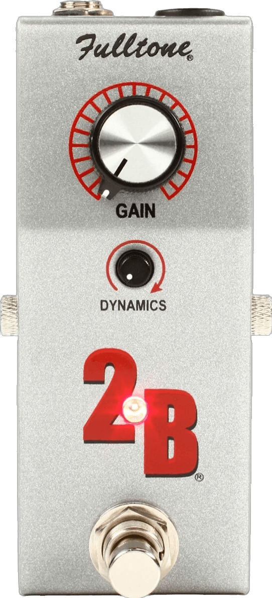 The Fulltone 2B Boost is a compact clean boost effects pedal designed to deliver up to 20dB of transparent gain. Based on the Boost channel circuit from the Fulltone FD3, this analog boost pedal features streamlined controls in a compact enclosure measuring 4.5" x 2.1" x 2.3". Input, output, and DC power jacks are rear-mounted to save pedalboard space, and the battery fits internally. The 2B Boost includes Fulltone’s proprietary “Dynamics” control, which reduces unwanted spikes and preserves note clarity at higher levels. This pedal employs true bypass switching for signal integrity when disengaged.