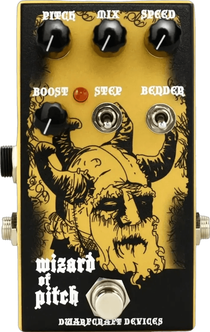 The Wizard is a pitch shifter effects pedal featuring a 32-bit audio resolution for lo-fi, glitch-inspired processing. The pedal offers a mix control for blending wet and dry signals and a speed parameter that crossfades between them. At zero, the speed control functions as a standard pitch shifter, while higher settings introduce dynamic modulation and shifting motion between the effected and original tones.