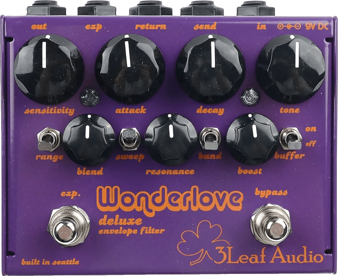The Wonderlove v2 is an envelope filter effects pedal designed to deliver dynamic, expressive filter sounds. It features a selectable bypass mode (true bypass or buffered bypass) and a control layout suited for wide frequency response. The updated version includes a second footswitch to alternate between envelope modulation and expression pedal input control. All input and output connections are located on the top panel for streamlined pedalboard integration.