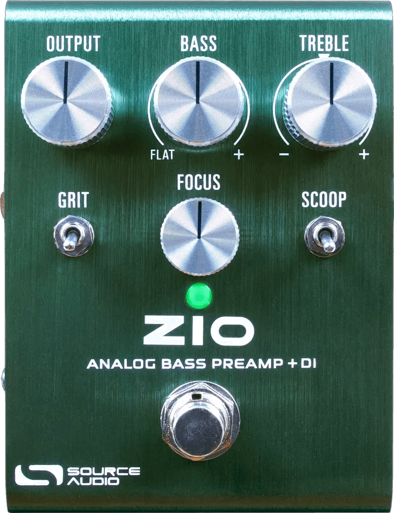 The Source Audio ZIO Analog Bass Preamp + DI is an analog preamp and direct injection (DI) pedal specifically designed for bass instruments. This bass preamp pedal includes EQ controls for bass, treble, and focus, along with tone-shaping toggles for grit and scoop. Equipped with Burr-Brown op-amps for high headroom and low noise, the pedal supports three independent outputs: ¼” instrument output, balanced XLR DI output with ground lift, and a dedicated headphone output. The output gain ranges from -6dB to +16dB above unity, and a side-mounted gain control adjusts the grit switch’s overdrive character. The bass control boosts around 100Hz, while the focus knob acts as a variable high-pass filter. The treble knob adjusts higher frequencies for articulation or smoothing. The GRIT toggle adds transformer-style breakup, while SCOOP applies a midrange cut for clarity.