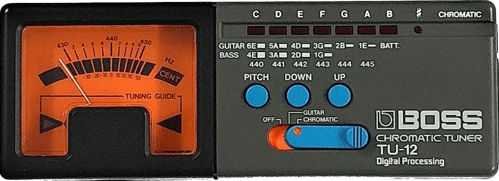 The BOSS TU-12 is a chromatic tuner designed for accurate and reliable instrument tuning. Featuring both needle and LED pitch indication, this BOSS effects pedal allows for precise visual feedback when tuning a variety of stringed and fretted instruments. A built-in microphone enables acoustic instrument tuning, while dedicated input and output jacks support direct connection in a signal chain. The TU-12 also offers calibration control to accommodate alternate tunings.