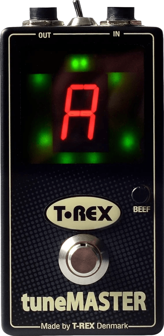 The T-Rex Tunemaster is a chromatic tuner pedal designed for precise instrument tuning with high visibility on stage. This pedal features a large, easy-to-read display with LED indicators, ensuring clear tuning feedback even in challenging lighting conditions or from a distance. The Tunemaster is equipped with a selectable buffer circuit to maintain signal clarity and strength, with an output level control for additional tonal adjustment. Alternatively, users can switch to true bypass operation with a simple toggle, allowing flexibility in pedalboard signal routing. The unit is engineered for low noise and high accuracy and is specified as compatible with bass instruments.