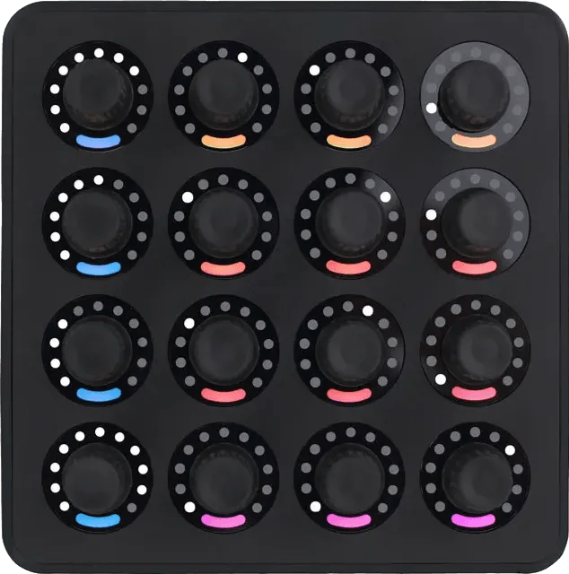 The Midi Fighter Twister is a MIDI controller designed for parameter control in digital audio software and hardware. It features 16 endless rotary encoders, each paired with built-in push-button functionality. Each encoder can send continuous control changes with position feedback displayed via integrated LED rings, ensuring accurate parameter matching between the controller and connected devices when switching banks or settings. The push-button action of every encoder allows users to reset parameters or toggle functions as assigned in their MIDI mapping.