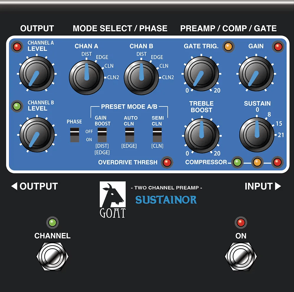 The Goat Blue Series Sustainor is a rack preamp emulator effects pedal designed to capture the signature sustain, compression, and drive characteristics of the SR&D Rockman Sustainor Model 200. Developed by TC Gakki "Goat" in December 2023, this pedal recreates the classic '80s rack tone in a compact stompbox format, while incorporating modern enhancements for today’s pedalboards. The Goat Blue Series Sustainor is engineered for seamless integration with effects chains, offering versatile sound shaping and reliable performance.