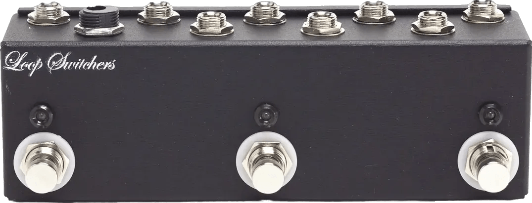 The 3 Channel True Bypass Loop Switcher manages up to three effects loops, enabling true bypass switching for minimizing tone loss and signal degradation in pedalboard setups. This loop switcher is available in both clickless and traditional configurations. The clickless version employs a relay system for silent, soft-touch loop activation, eliminating the loud mechanical click of standard switches. Handwired and PCB models utilize latching footswitches that audibly click when pressed but maintain electronic silence, ensuring signal integrity is unaffected.
