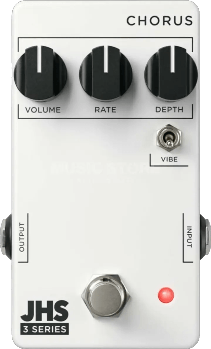 The JHS 3 Series Chorus is a modulation effects pedal designed to provide classic chorus and pitch vibrato sounds. This JHS effects pedal features Rate and Depth controls to adjust the speed and intensity of the modulation effect, ranging from subtle shimmer to pronounced pitch movement. The Vibe toggle switch removes the dry signal, enabling true pitch vibrato output. This analog chorus pedal is equipped with true bypass switching for transparent signal integrity. The JHS 3 Series Chorus is manufactured in Kansas City, MO, and is part of the JHS 3 Series line, known for straightforward controls and robust build quality.