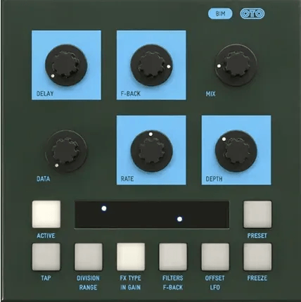 The OTO Machines BIM is a 12-bit stereo delay effects processor designed to deliver classic digital delay sounds inspired by early 1980s studio delay units. It features analog processing on the input and feedback path, including companders, limiters, and low-pass filtering, with the delay created through 12-bit AD/DA conversion. The stereo output configuration allows for spacious effects, while the unique combination of analog and digital circuitry results in characteristic sonic degradation and dark timbral shaping during extended feedback. BIM utilizes both vintage and modern hardware elements to produce distinctive delay textures.