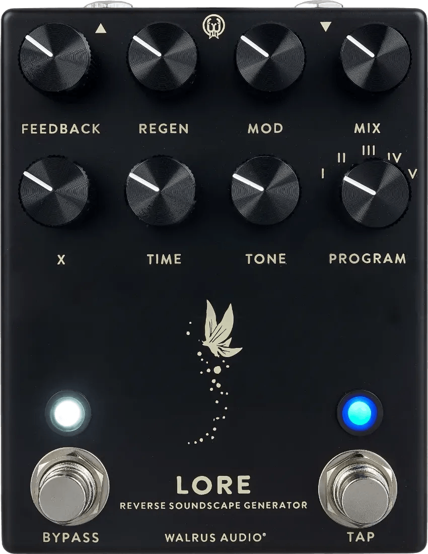 The Walrus Audio Black Edition Lore is an ambient reverse delay and reverb pedal designed for creating complex soundscapes. This stereo modulation effects pedal is equipped with five selectable programs, each combining reverse delay and reverb circuits. Two DSP chips run in series, each with a dedicated analog feedback path, enabling unique routing and expansive effects. The Lore offers features such as time-stretching, reversing, pitch-shifting, and ambient textures, making it suited to a range of musical setups.
