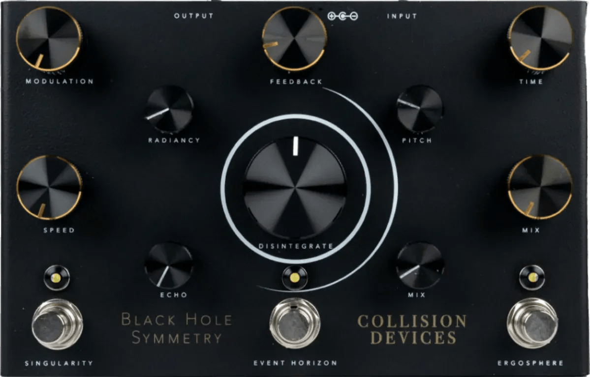 The Collision Devices Black Hole Symmetry is a multi-effects pedal that combines modulated delay, pitch-shifted reverb, and distortion fuzz in a single enclosure. The pedal features three independent sections—Ergosphere (modulated delay), Event Horizon (pitch-shifted reverb), and Singularity (destruction fuzz)—which can be engaged individually or in combination, providing flexible sound sculpting options. Hand-assembled and tested in France, this effects pedal offers a range of analog and digital processing suited for signal experimentation.