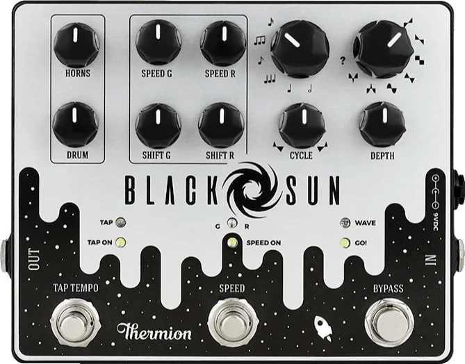 The Thermion Black Sun is a rotary speaker and phaser effects pedal designed for versatile modulation sounds. This pedal combines traditional rotary speaker simulation with a range of phaser options. Users can toggle between two individually adjustable speeds and use the built-in tap tempo. The interface includes controls for Note Multiplier, Waveform selection, Cycle, and Depth, allowing precise adjustment of modulation character. A two-band EQ provides further tonal shaping. The Thermion Black Sun supports a wide variety of settings ideal for both subtle modulation and experimental textures.