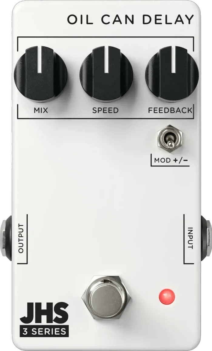 The JHS 3 Series Oil Can Delay is a delay effects pedal designed to deliver the distinctive, modulated echo and warble associated with vintage oil can delay units. This pedal features simple controls to adjust delay time, mix, and feedback, providing access to a range of lo-fi, modulated delay textures. Built with true bypass switching, the JHS 3 Series Oil Can Delay offers clear signal integrity when the effect is bypassed. Standard quarter-inch input and output jacks deliver straightforward connectivity to pedalboards and signal chains.