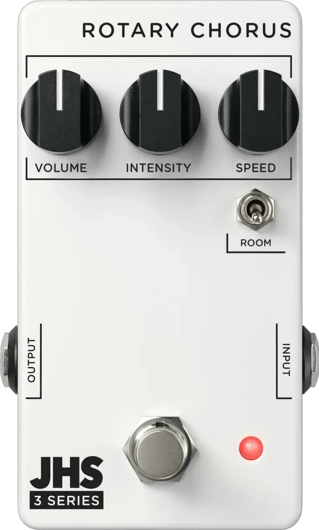 The JHS 3 Series Rotary Chorus is a rotary chorus modulation effects pedal designed to emulate the Doppler effect of a rotating speaker. This JHS effects pedal offers control over modulation depth with the Intensity knob and adjusts rotation speed with the Speed control. A Room toggle switch engages a reverb-style ambiance, simulating room microphone characteristics commonly heard in rotary speaker recordings. The pedal features true bypass switching and supports mono input and output connections.