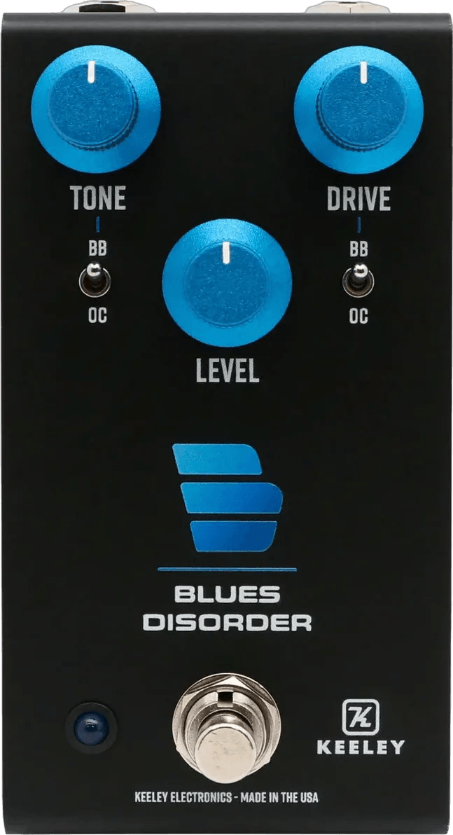 The Keeley Blues Disorder is an overdrive and distortion effects pedal featuring dual circuits and four selectable drive modes. Equipped with two independent switches, users can separate the tone control from the clipping section, enabling different combinations for hybrid sounds. The BB side delivers low gain, soft-clipping overdrive, while the OC side provides a hard-clipping distortion. Both switches engaged yield a blues-style soft-clipping response, while disengaged switches offer a fuller distortion. The pedal operates with three main controls for simple adjustment, and includes the option to select between true bypass or buffered bypass. The Keeley Blues Disorder is designed and manufactured by Keeley Electronics using a durable aluminum enclosure.