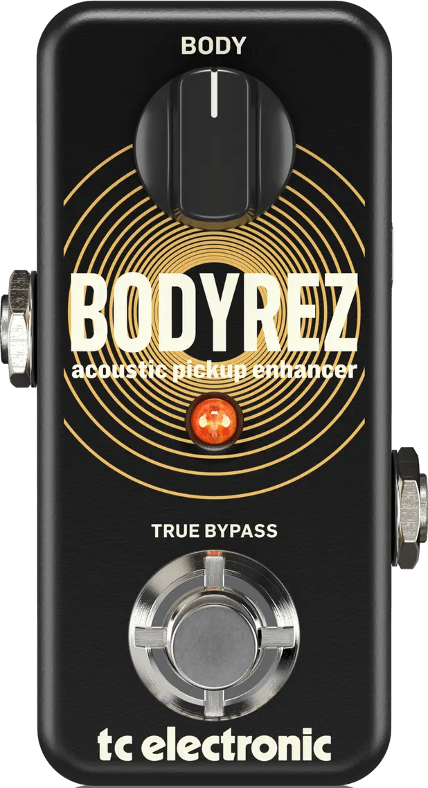 The TC Electronic BodyRez is an acoustic pickup enhancement effects pedal designed to optimize the natural resonance and tone of acoustic instruments equipped with pickups. This compact effects pedal features a streamlined single-knob control, providing instant access to a range of tonal enhancements while incorporating built-in feedback suppression to reduce unwanted noise during live performance or recording. The BodyRez pedal uses true bypass switching for transparent tone when disengaged and is compatible with bass instruments using acoustic pickups.