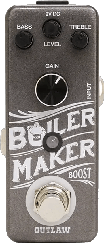 The Outlaw Effects Boilermaker Boost pedal is a compact clean boost effects pedal designed to provide over 20dB of transparent volume increase. This analog boost pedal features two active EQ controls, each offering ±15dB of adjustment to shape treble and bass frequencies. The Gain Control allows for blending in warm, subtle overdrive in addition to clean boost. The pedal is engineered to enhance harmonic content, output level, or push amplifiers and other pedals in the signal path.