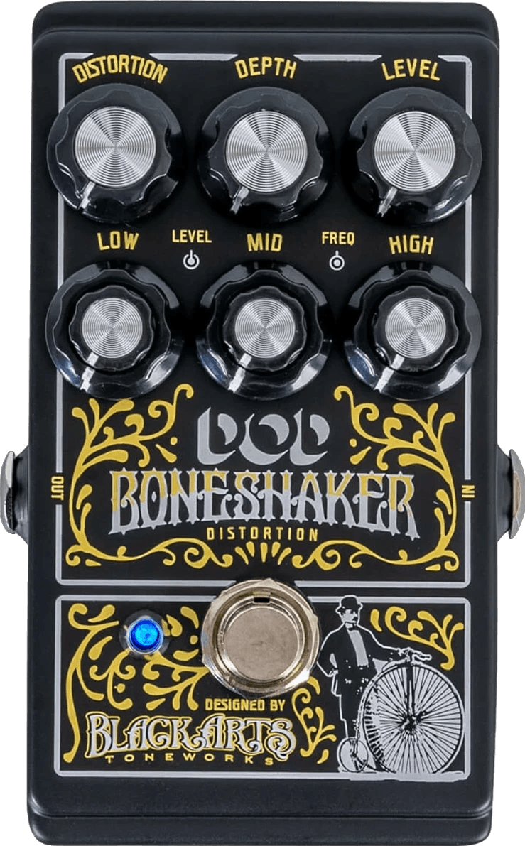The DOD Boneshaker Distortion pedal is a distortion effects pedal developed in collaboration with Black Arts Toneworks. It combines a high-gain dirty boost circuit with a 3-band semi-parametric EQ, offering control over bass, midrange, and treble frequencies. This pedal is designed to provide saturation, drive, and detailed frequency shaping, enabling users to push amplifier input stages or refine the output of other effects. The semi-parametric EQ allows for precise adjustment of each frequency band, giving musicians detailed tone-sculpting options. The Boneshaker is compatible with bass instruments.