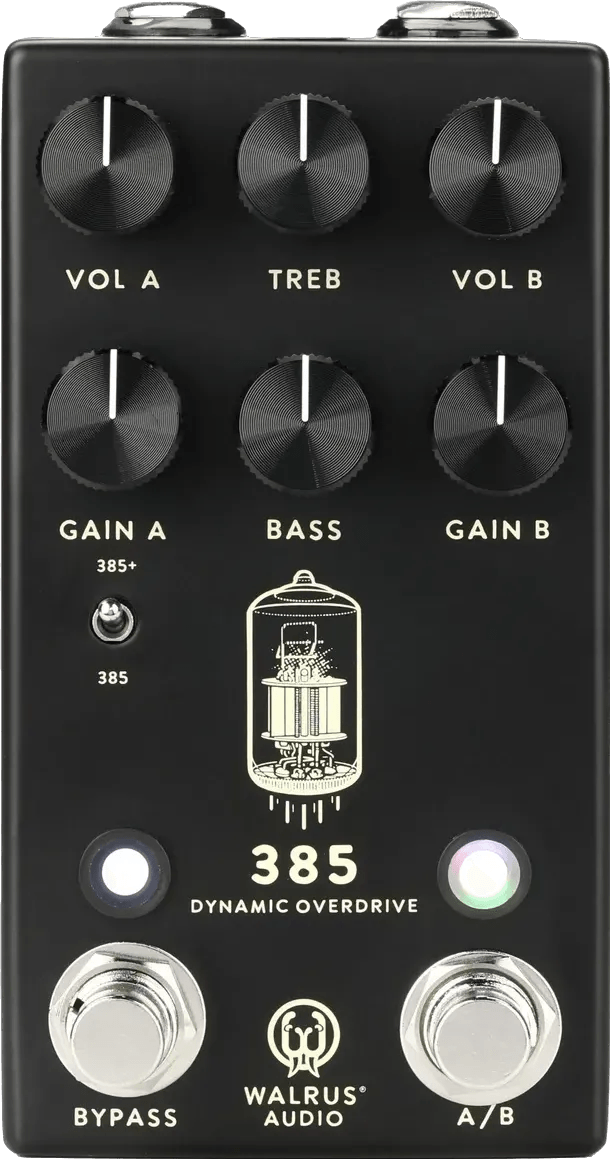 The Walrus Audio 385 Overdrive MKII Black is an overdrive effects pedal designed to emulate the dynamic, tube-like response of the Bell and Howell Filmosound 385 projector. Updated with the MKII release, this analog overdrive pedal features an A/B switch to select between two independent sets of volume and gain controls, enabling quick switching between gain structures. The 385+ switch increases saturation, offering an additional high-gain mode for enhanced distortion. Core controls include standard gain, volume, bass, and treble controls, allowing precise adjustment of tone and level.