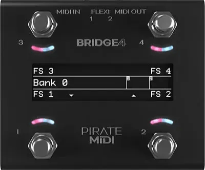 The Pirate MIDI BRIDGE4 is a compact MIDI foot controller designed for device control and flexible MIDI routing in music setups. It supports up to 100 banks with more than 80 programmable MIDI messages per switch, offering stackable messages for advanced control. Powered by a fast ARM processor, the MIDI controller includes ample onboard storage to accommodate firmware and feature updates. The BRIDGE4 maintains a streamlined footprint while delivering customizable MIDI workflows for live or studio environments.